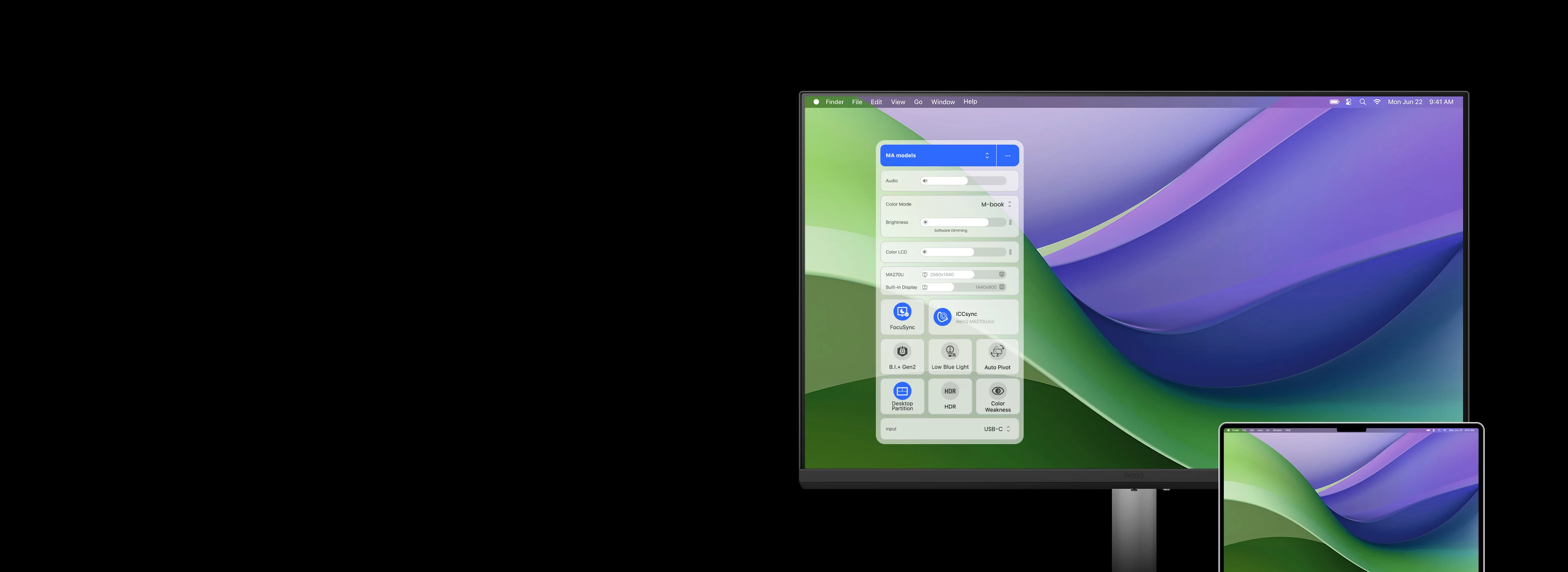 Monitor seri MA juga menawarkan integrasi tanpa batas dengan MacBook, menampilkan sinkronisasi kecerahan dan volume dengan kontrol MacBook dan pengaturan sederhana seperti Mac melalui perangkat lunak BenQ Display Pilot 2 dengan pengaturan layar sekali klik.