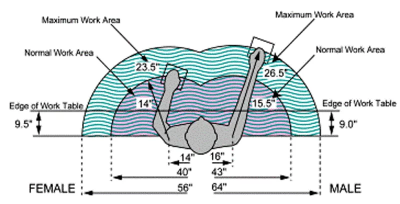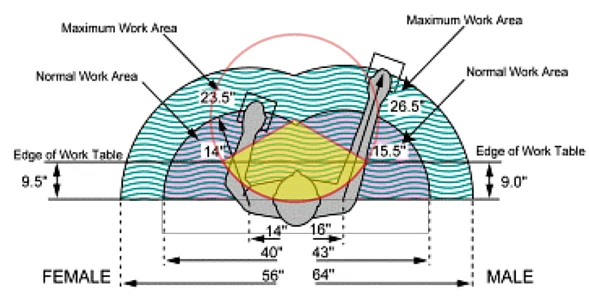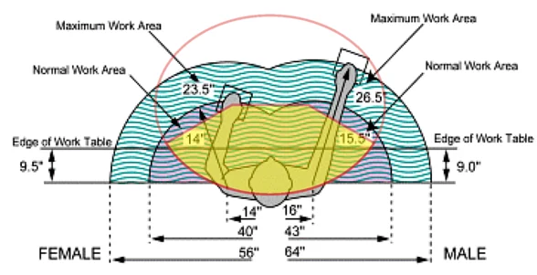 人體工學圖示,左右寬、前後窄的工作區域