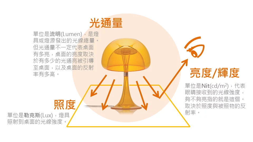 夠不夠亮理論上應該看「亮度」,因為它代表眼睛實際接收到光線強度。但是亮度的量測儀器昂貴而取得不易,因此一般改用「照度」來評斷桌面夠不夠亮,因為照度計便宜易取得。