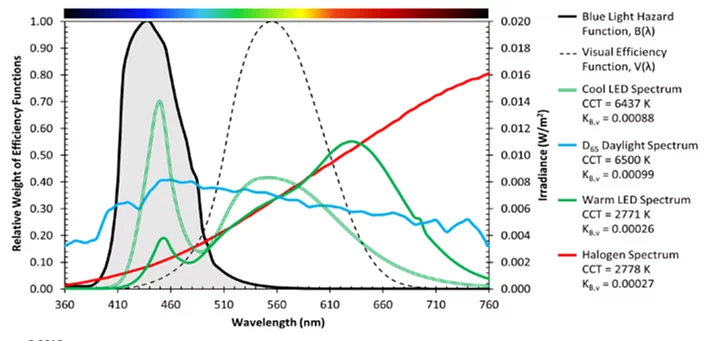 色溫代表白光的顏色,色溫越低,顏色越黃越溫暖;色溫越高,顏色越白越冷。色溫影響褪黑激素的分泌。褪黑激素影響人的生理週期,褪黑激素的分泌增加時,會讓人想入睡。 光線裡的藍光容易抑制褪黑激素的分泌,而色溫越高越冷白的光線裡所含的藍光比例越高。