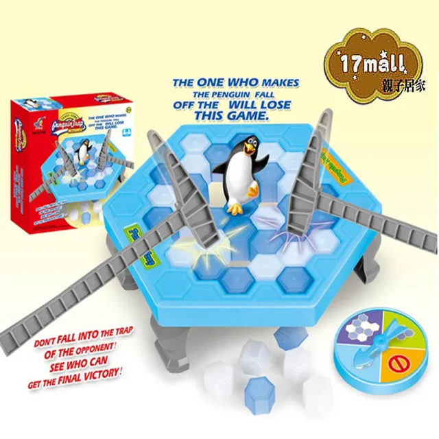 拯救企鵝是一款敲冰塊但不能讓冰上企鵝掉下來的遊戲,適合2-4人遊玩,大約5-10分鐘可以玩完一輪,官方建議適合年齡為3歲以上。玩家要輪流轉動轉盤,根據轉盤指示,敲打指定顏色的冰塊,敲打後讓冰上企鵝落地的玩家就輸了,可以訓練孩子的專注力。
