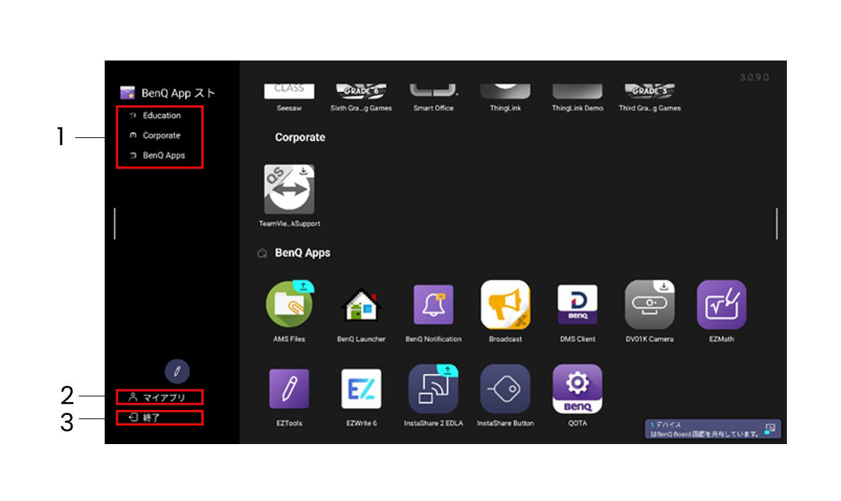 - アプリ一覧:Education(教育)、Corporate(法人)、BenQ Apps(BenQアプリ)ごとにカテゴリ分けされたアプリを閲覧できます。
