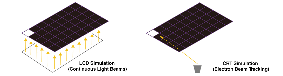 La luz de fondo se enciende y luego se apaga en un punto fijo. Esto ayuda a evitar imágenes residuales no deseadas, ya que no queda luz de un punto fijo anterior. En otras palabras, no ves una imagen persistente (desenfoque de movimiento) porque no hay haz de luz pasando por más de un punto a la vez.
