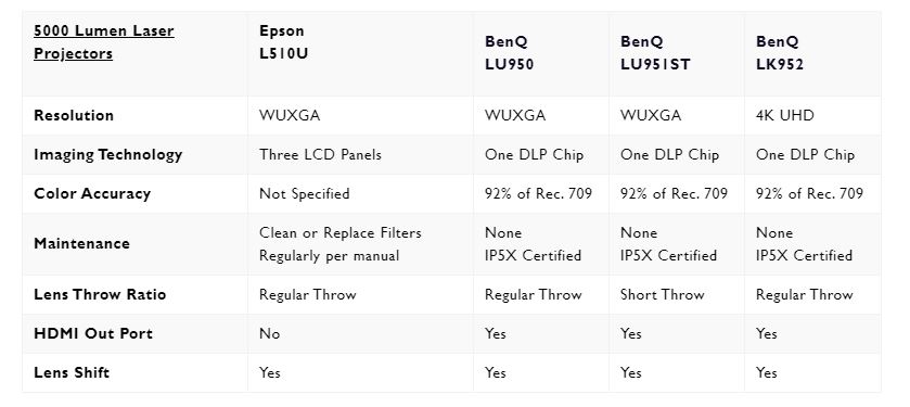 Here is an example of some of the alternatives you can consider when looking at alternatives to the Epson L510U projector. BenQ is the second largest projector brand in the world, and the leading brand of projectors using DLP technology. For the most part, the prices between the base models are very close, while features such as short throw lenses and 4K resolution will be slightly higher in price.