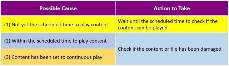 Please check the schedule of content under X-Sign Designer for the cause. The table below lists the possible causes and corresponding actions to take: