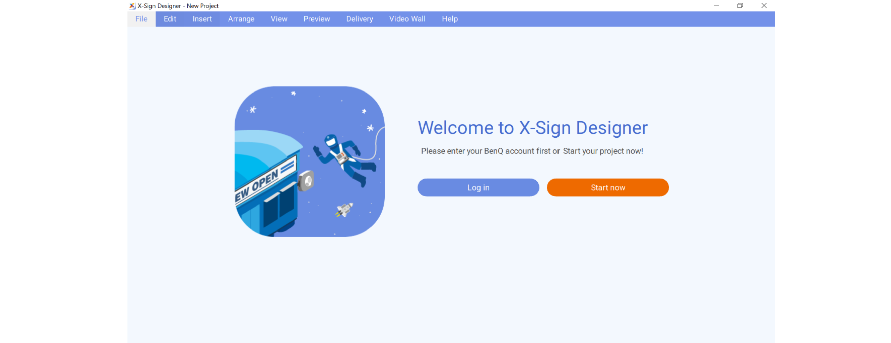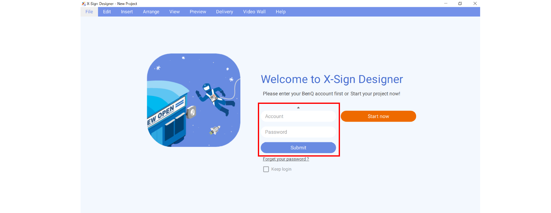 • You can also use X-Sign Designer without logging in the account by clicking Start now. You cannot upload content on X-Sign Manager only after logging in the account. Read Uploading your content from Designer for more imformation.