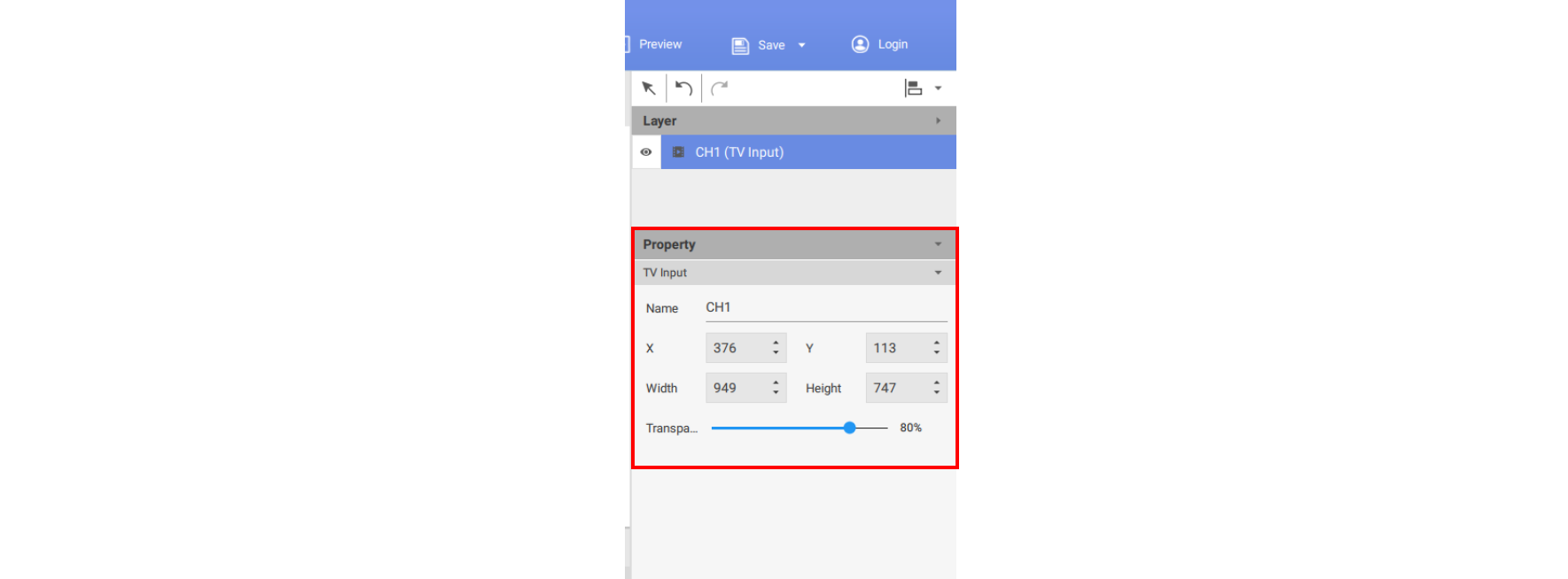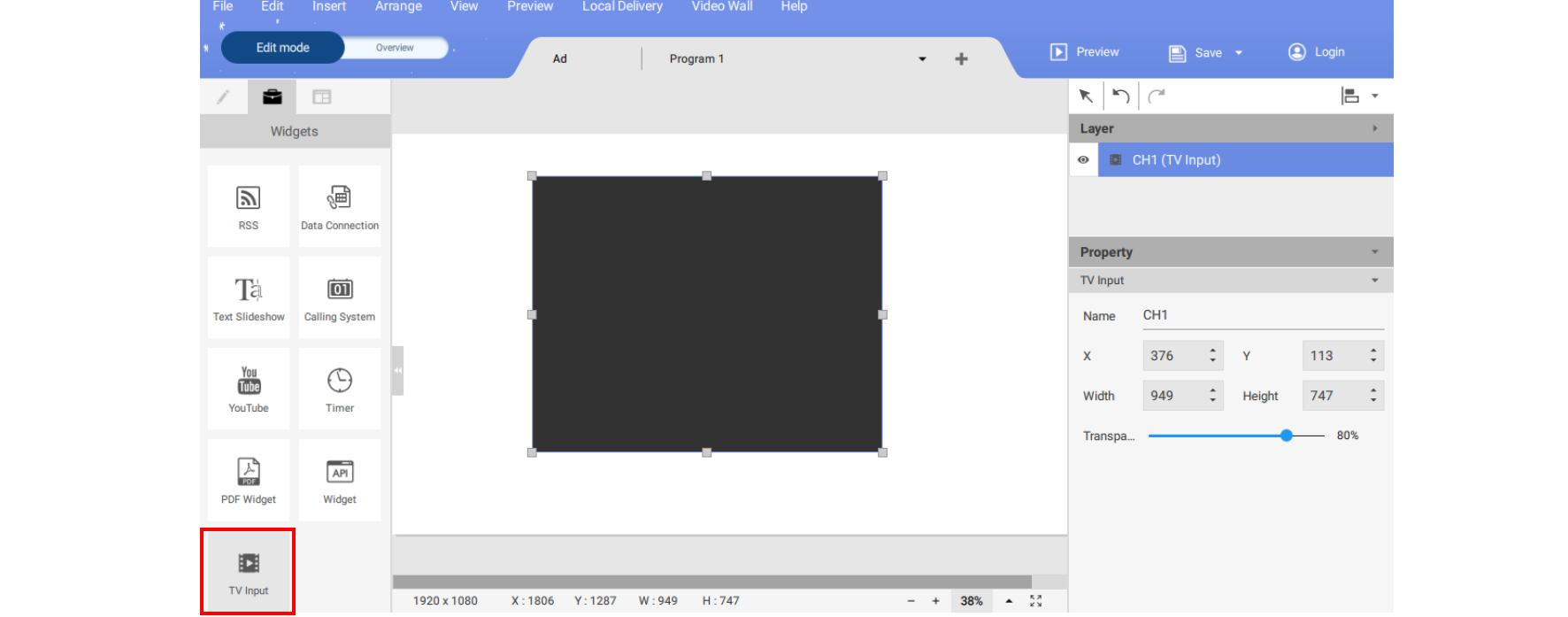 3. You may set the properties of the TV Input widget in the editing area on the right panel.