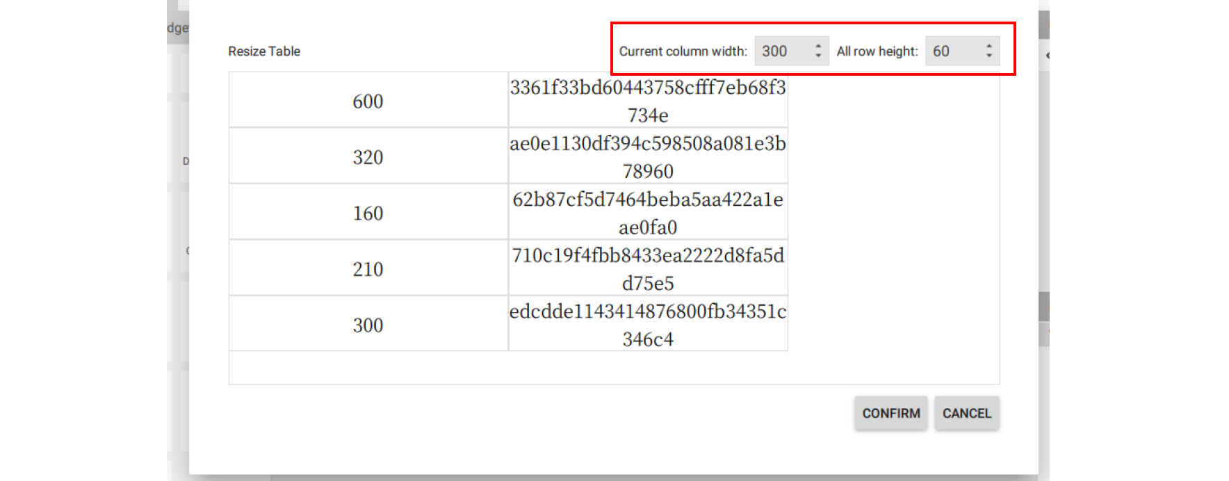3. You can resize the table by double-clicking the table. An editing window will pop up. You can change the current column width or all row height.