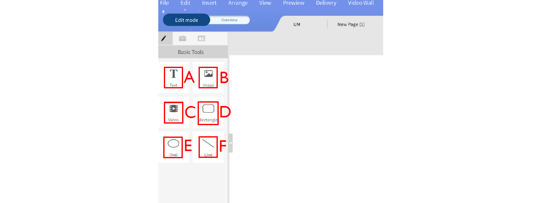 1. Click the button to open the Basic Tools panel. The Basic Tools panel allows you to add text, media and shapes to a page. Click on one of the following icons to add a new element to the canvas:
