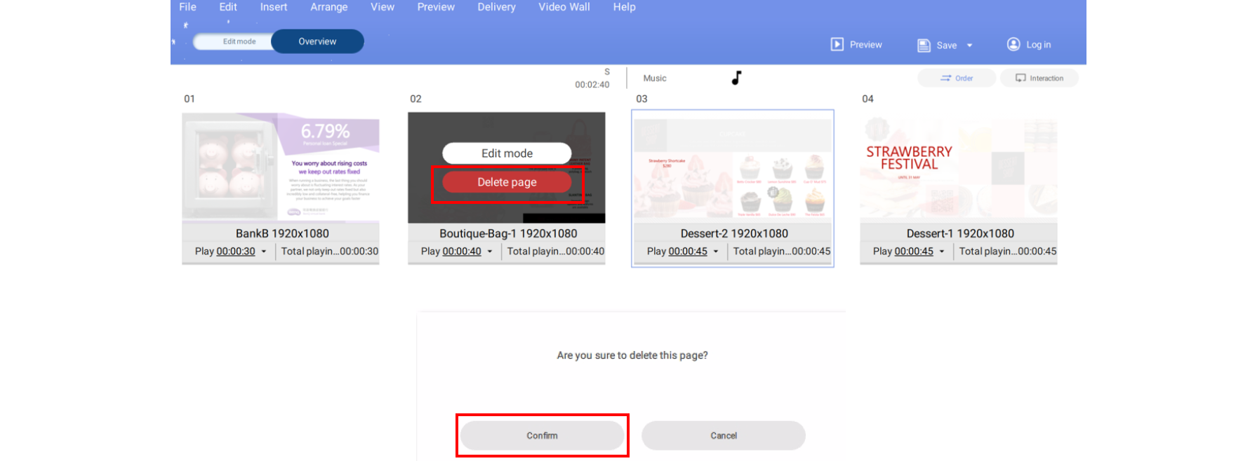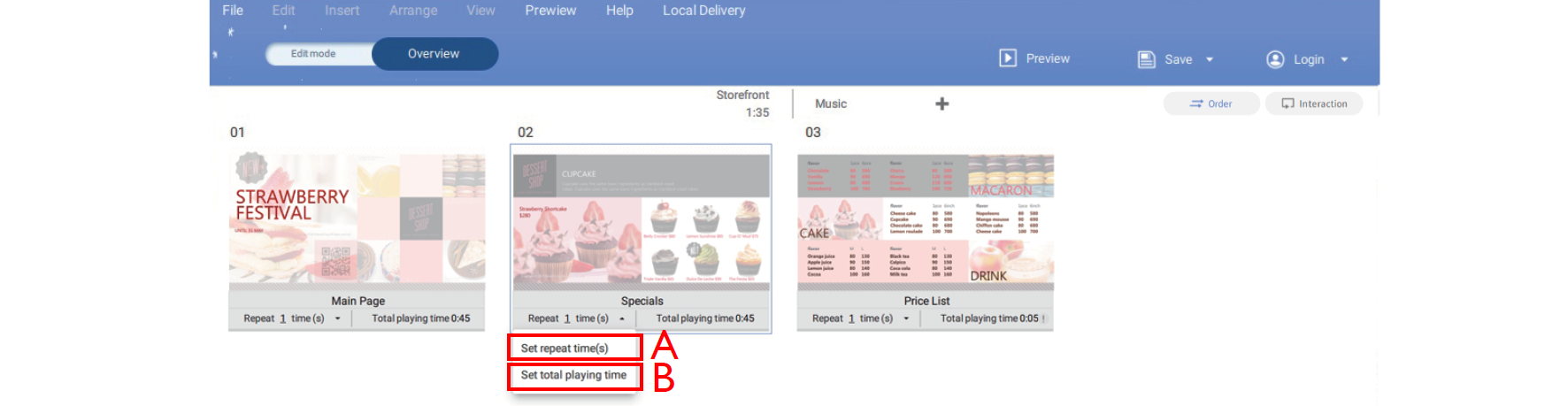 7. Select the icon on the page icon and click Set Repeat Time(s) or Set Total Playing Time to have the page repeat or change the time duration for a page.
