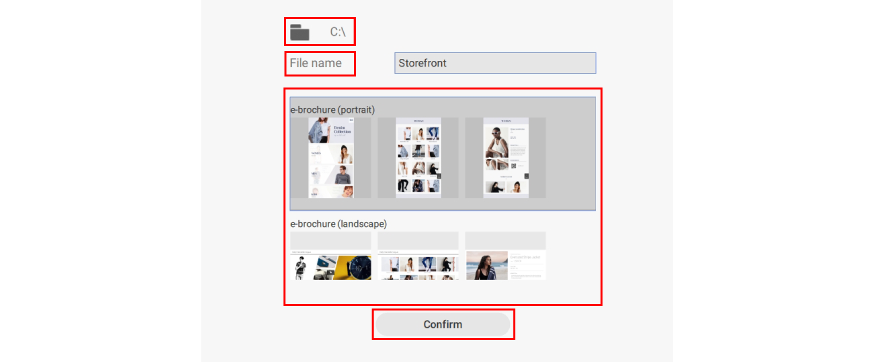 2. Choose a location on your hard drive to save the project and create a File name. Select the e-brochure template you want to use and click Confirm.