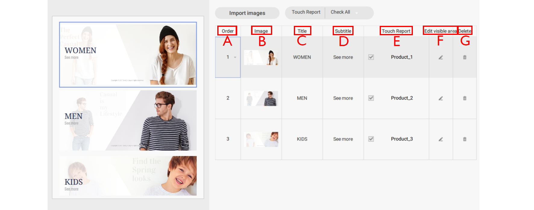 E. Touch Report – Touch Report allows you to track the touchscreen data of specific pages or categories. Check the box to generate Touch Report data for the category.