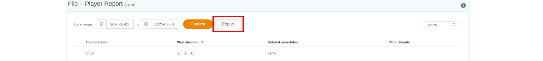 2. X-Sign records the playback history of each file on each device. Click Export, then the Player report is exported as an .xls or an .xlsx file type.