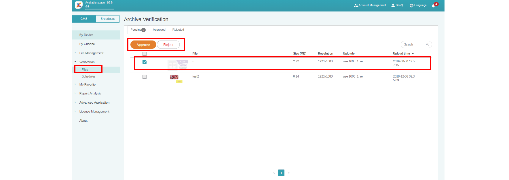2. Select the file to be approved or rejected, then click Approve or Reject.