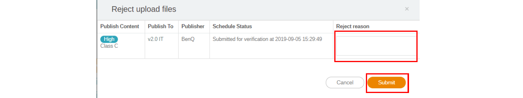 3. You need to fill in the reason you reject the file to be added to the schedule. This is a required field. Click Submit to proceed.