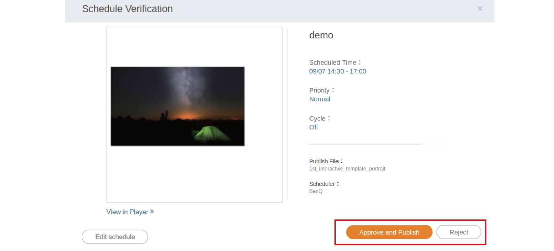 6. You can view the file on X-Sign Player and edit schedule. Click Approve and Publish or Reject to proceed.