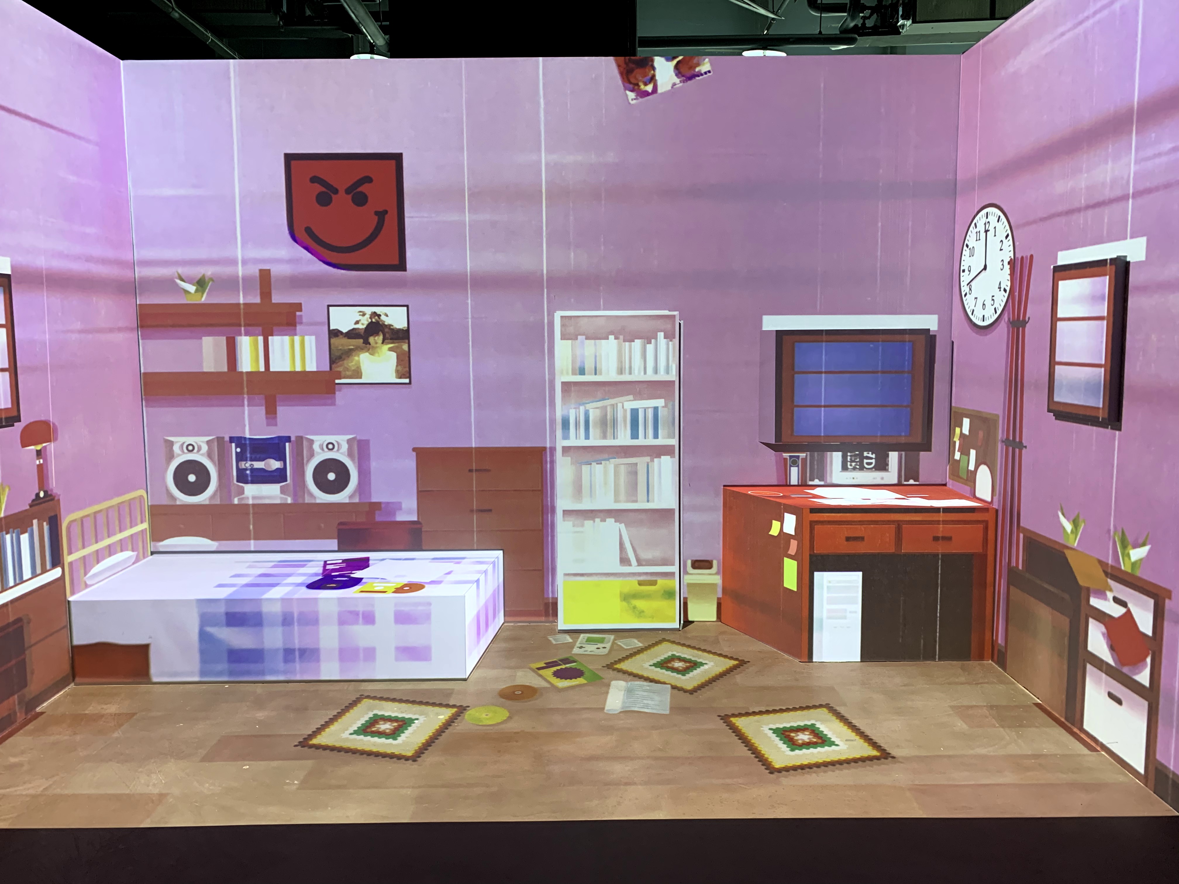 《年輕人的精神世界》是一個「房間」的場景:單人床、書桌、窗戶、書櫃……等,都以BenQ投影機 LU9245 的拼接、投放,透過音樂的切換,幻化出不同時代年輕人的生活空間感覺,孤獨、叛逆、反思、獨立、自由……年輕世代的共同語言卻有著不同的時代氛圍。場景的變化透過四台 LU9245 與兩台 LU951 的拼接投影,以 7000 流明的亮度流明精準投射在所設定的範圍裡,如立面的窗戶、海報,平面的書桌、單人床等,飽和的影像呈現,讓立體的場景更真實,高亮度的影像交織與拼接,也能做到不互相干擾;穩定的輸出品質,讓場景轉換與隨著音樂躍動的韻律設計,順暢地流動著。